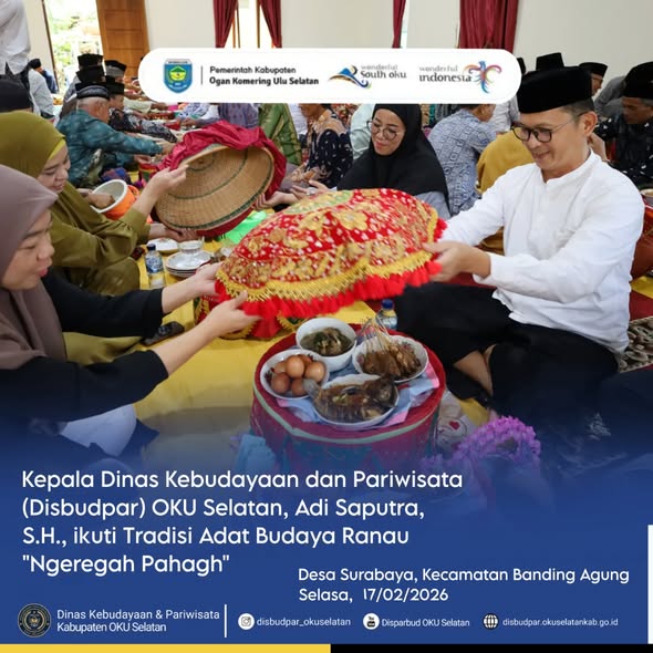 BANDING AGUNG – Kepala Dinas Kebudayaan dan Pariwisata (Disbudpar) OKU Selatan, Adi Saputra, S.H., ikuti Tradisi Adat Budaya Ranau “Ngeregah Pahagh” di Desa Surabaya, Kecamatan Banding Agung. Selasa pagi (17/02/2026).